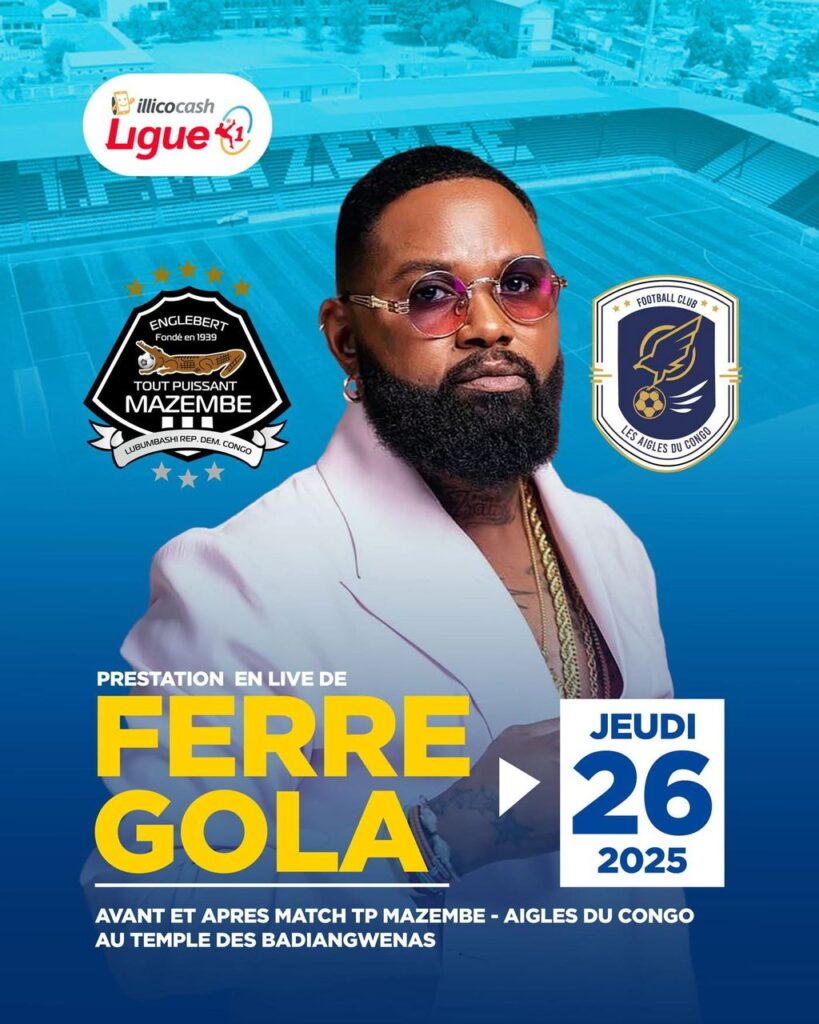 La dernière journée de la saison 2024-2025 du championnat national de football (Ligue 1) promet un spectacle total. Le géant sponsor Illicocash a annoncé ce samedi 22 juin que son ambassadeur, l’artiste congolais Ferré Gola, livrera deux prestations exceptionnelles avant et après le match très attendu entre le TP Mazembe et le FC Les Aigles du Congo.