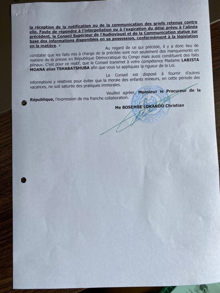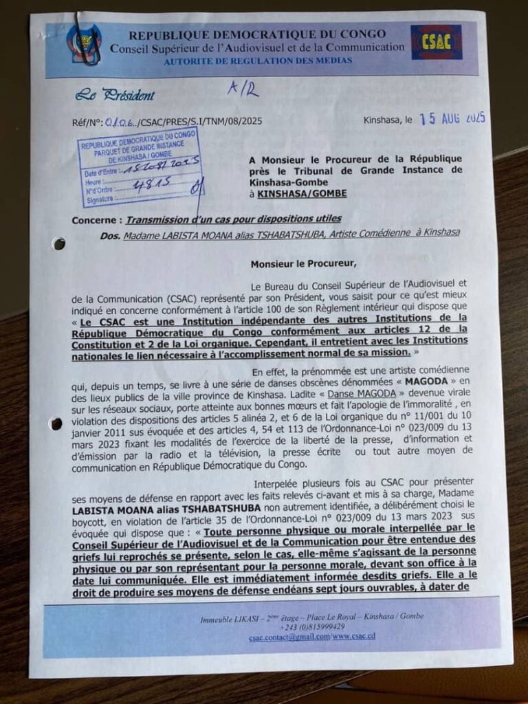 « la prénommée est une artiste comédienne qui, depuis un temps, se livre à une série de danses obscènes dénommées Magoda en lieux publics de la ville de Kinshasa. Ladite danse devenue virale sur les réseaux sociaux, porte atteinte aux bonnes moeurs et fait l’apologie de l’immortalité », souligne la correspondance du CSAC signée ce 15 août, qui précise également que ces faits violent les dispositions de l’éthique du Conseil supérieur.