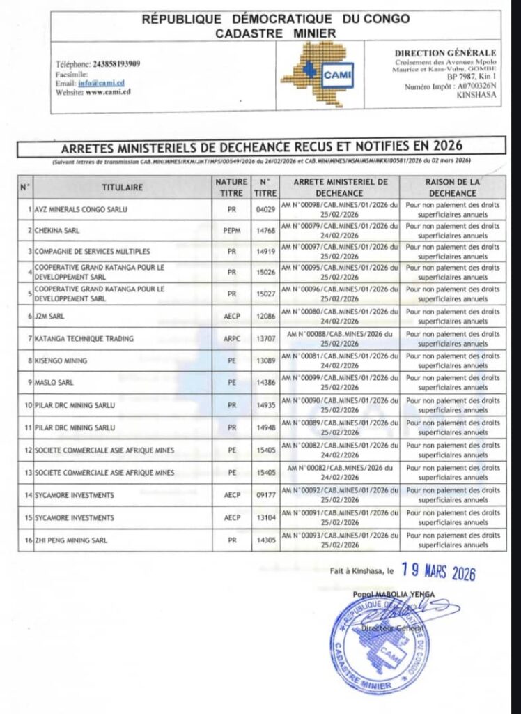 Le ministère des Mines a annoncé une série de mesures importantes visant à assainir le secteur minier en République démocratique du Congo. À travers le Cadastre Minier, l’institution a informé l’opinion publique de la publication, en 2026, de plusieurs arrêtés ministériels portant déchéance de titres miniers.