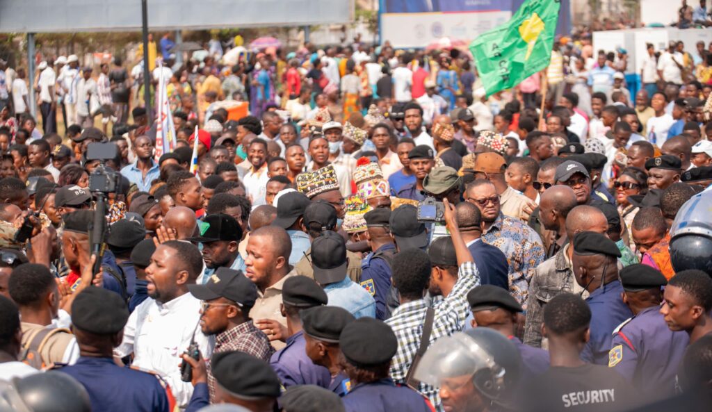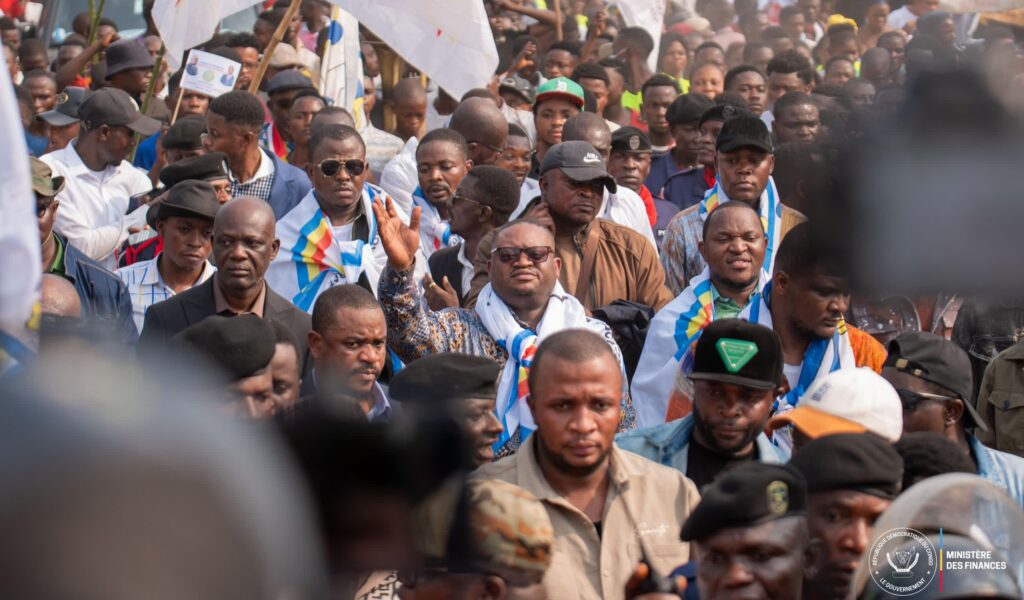 À sa descente d’avion à l’aéroport de Bipemba, l’Argentier national a été reçu par une délégation composée de chefs coutumiers, d’acteurs politiques locaux et d’une foule impressionnante de citoyens venus exprimer leur soutien. S’en est suivie une procession pédestre animée, marquée par des chants et des danses, jusqu’au croisement du boulevard Laurent-Désiré Kabila et de l’avenue CNSS.