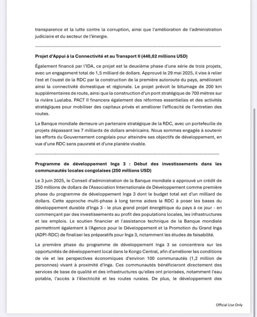 Dans un communiqué officiel, le Directeur des opérations de la Banque mondiale pour la RDC a déclaré : « C’est une excellente nouvelle pour la RDC. La Banque mondiale est profondément engagée à améliorer la qualité de vie des Congolais. L’approbation de ces projets témoigne de notre dévouement indéfectible à une prospérité inclusive et durable. »