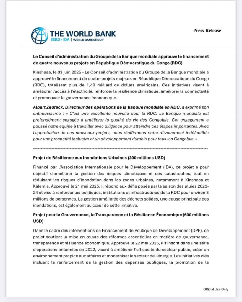 Le Conseil d’administration du Groupe de la Banque mondiale a approuvé, ce mardi 3 juin 2025, un financement total de plus de 1,4 milliard de dollars américains pour quatre projets clés en République démocratique du Congo (RDC). Ces projets portent sur les secteurs de la résilience climatique, de la gouvernance, des infrastructures de transport et du développement énergétique.