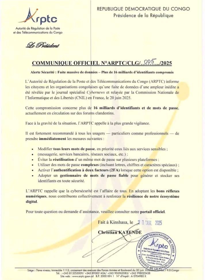 L’Autorité de Régulation de la Poste et des Télécommunications du Congo (ARPTC) a formellement alerté ce vendredi 11 juillet, les organisations et opérateurs des télécommunications opérant en RDC, sur « une fuite de données d’une ampleur inédite » et a recommandé des mesures d’urgence au regard de cette situation.