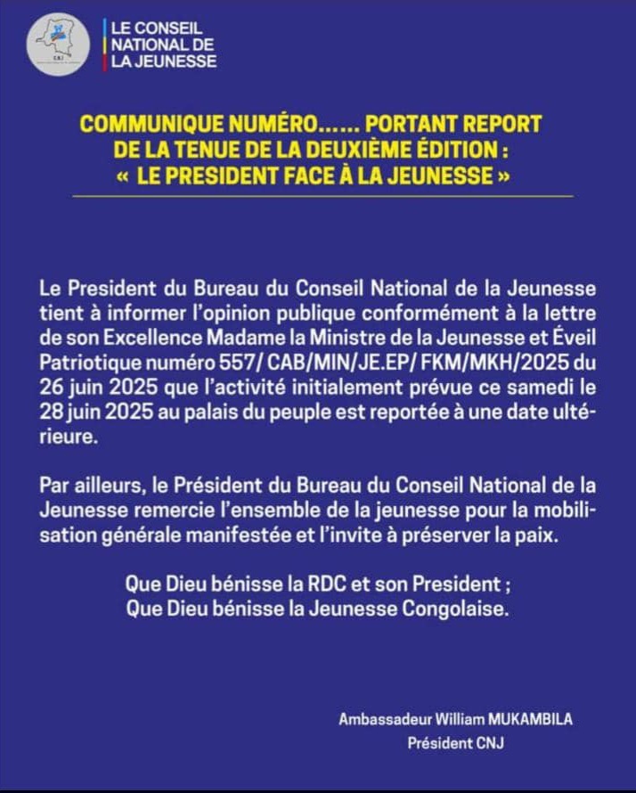 Le Conseil national de la jeunesse (CNJ), qui est l’initiateur phare de l’événement mettant en discussion le président de la République Félix Tshisekedi face à la jeunesse congolaise, annonce officiellement le report de cette grande activité dans un courrier à une date ultérieure, alors que ce dernier a été initialement prévu ce samedi 28 juin, au palais du peuple de Kinshasa.